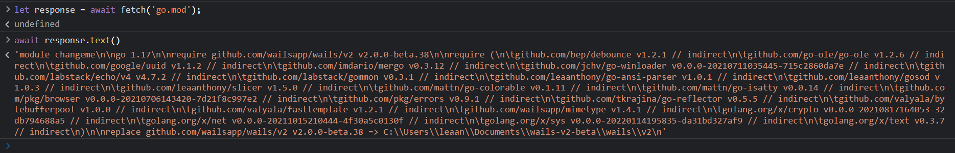wails devコマンドでアプリケーションを開発モードで実行すると、次のように出力されます:
