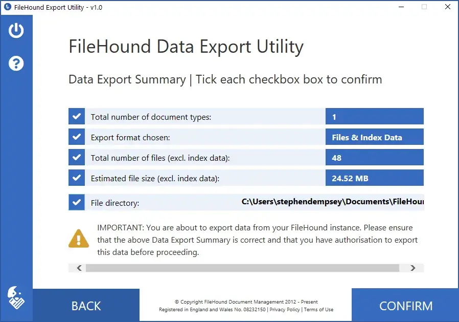 FileHound Export Utility 允许 FileHound 管理员运行安全文档和数据提取任务以备选备份和恢复目的。 此应用程序将根据您选择的过滤器下载保存在 FileHound 中的所有文档和/或元数据。 元数据将以 JSON 和 XML 格式导出。